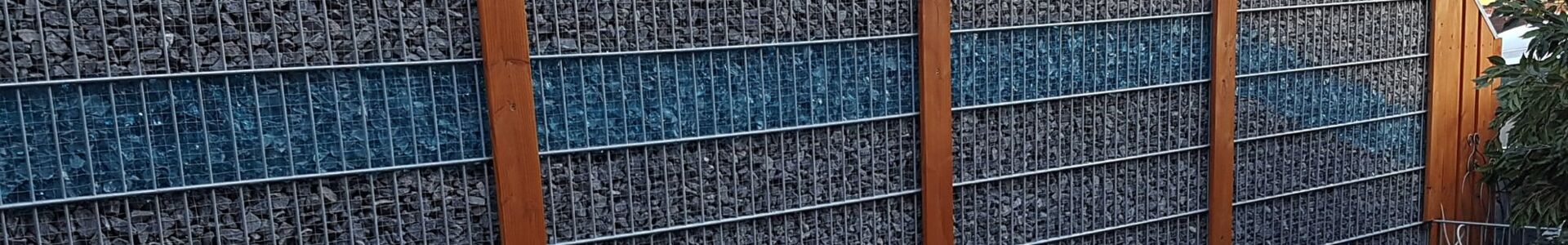 Gabions filled with coloured or clear glass rocks | glass stones | glass chunks have a particularly creative touch when combined with natural stones.